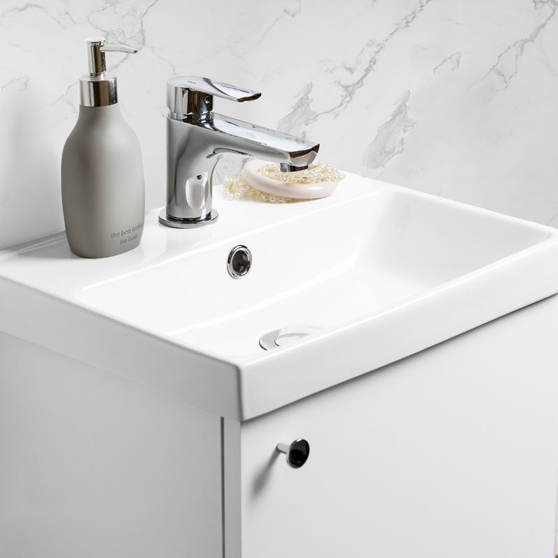 Porsliini pesuallas kompaktilla mitoilla. Pehmeästi pyöristetty kaukalo etureunaan asti antaa maksimaalisen tilan. Ylivuotosuoja CL15.